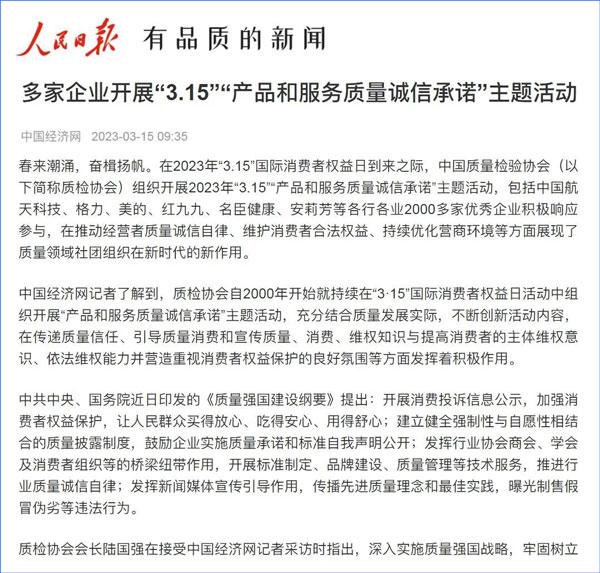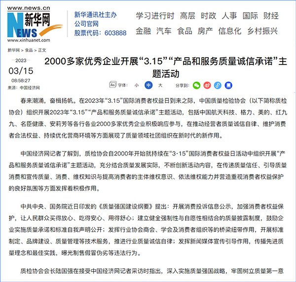 中國(guó)經(jīng)濟(jì)網(wǎng):2000多家優(yōu)秀企業(yè)開展“3·15”“產(chǎn)品和服務(wù)質(zhì)量誠(chéng)信承諾”主題活動(dòng)