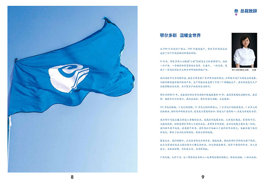 鄂爾多斯集團擁有成員企業(yè)100 多家,員工4 萬余人,羊絨產業(yè)和循環(huán)經濟產業(yè)兩大產業(yè)板塊,以及1436、ERDOS、鄂爾多斯1980、BLUE ERDOS、erdos KIDS 5個知名服裝品牌組成的品牌家族。站在新的發(fā)展起點上,鄂爾多斯集團將繼續(xù)以“立民族志氣,創(chuàng)世界名牌”為使命,遵循“科技綠色、循環(huán)發(fā)展”的經營主線,繼續(xù)發(fā)揚奮發(fā)有為、事在人為的創(chuàng)業(yè)精神,以更加雄厚的經濟實力,更加堅定的發(fā)展步伐、更加高遠的戰(zhàn)略構想,建設具有國際競爭力的幸福企業(yè),實現(xiàn)“溫暖全世界”的宏偉目標。