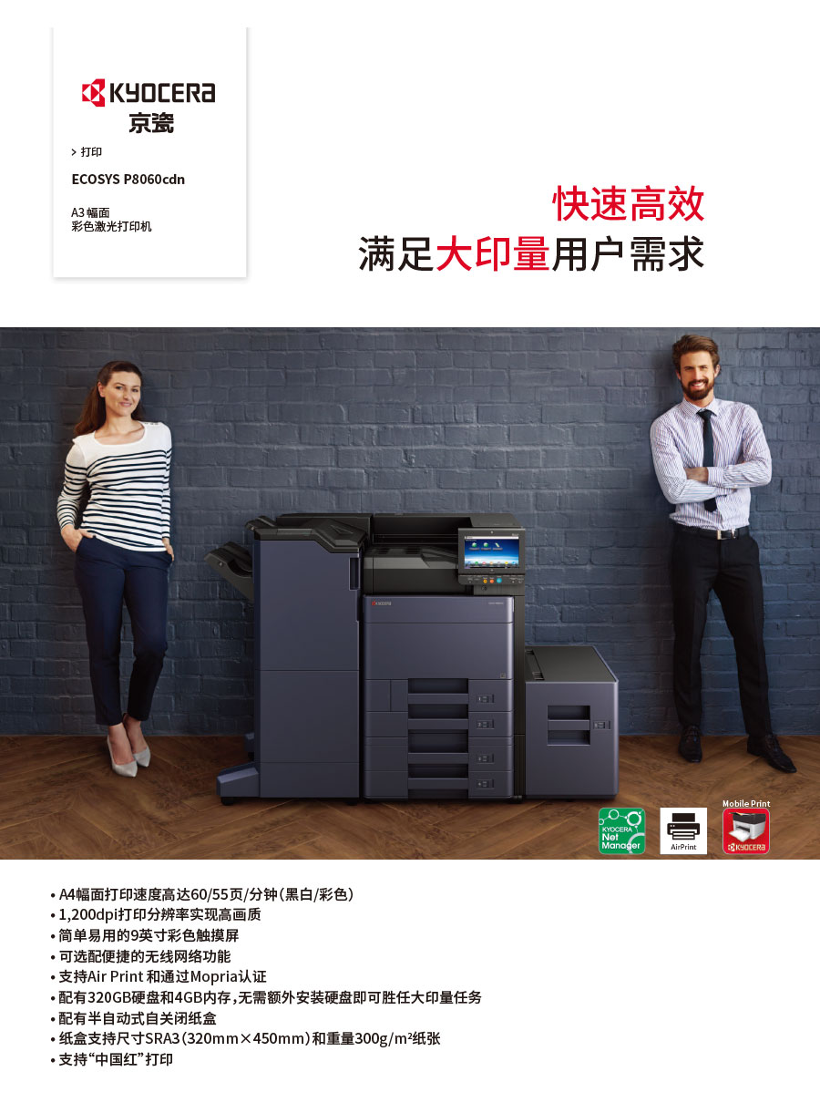 主要產(chǎn)品:KYOCERA京瓷激光打印機,一體機,復(fù)合機,生產(chǎn)型彩色噴墨數(shù)碼印刷系統(tǒng)及辦公信息系統(tǒng)的開發(fā)、設(shè)計、系統(tǒng)集成