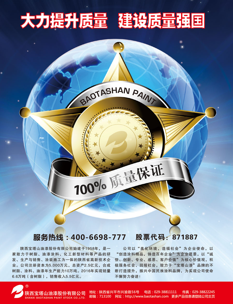陜西寶塔山油漆股份有限公司始建于1958年,公司生產(chǎn)基地位于歷史文化名城陜西省興平市,是一家致力于樹脂、油漆涂料、化工新型材料等產(chǎn)品的研發(fā)、生產(chǎn)與銷售、涂裝施工為一體的陜西省高新技術企業(yè)。憑借近60年的不懈努力,在合成樹脂、醇酸漆、民用建筑涂料、工業(yè)用防腐涂料、特種涂料等方面技術成熟,成為我國涂料領域的優(yōu)秀民族品牌。近年來,公司始終堅持高科技、高品質的技術發(fā)展戰(zhàn)略,時刻關注市場需求,不斷創(chuàng)新,致力于客戶成功,在工業(yè)防腐涂料、建筑涂料等環(huán)保涂料以及軍工等特種功能涂料方面,突破傳統(tǒng)工藝、引用前沿新技術、新材料、引領綠色涂料新變革,為消費者帶來更環(huán)保、更安全、更高科技含量的產(chǎn)品和貼心的服務。
