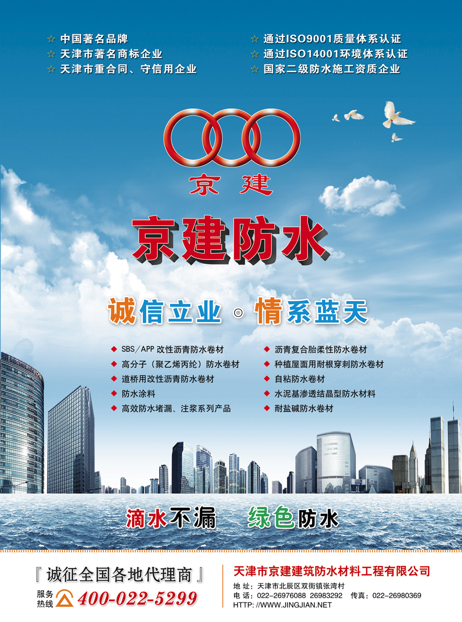 天津市京建建筑防水工程有限公司始建于1996年,隨著公司的逐步成長,目前已成為集新產品研發(fā)、生產、銷售、設計、施工、服務于一體的大型防水企業(yè),公司主導產品有SBS改性瀝青防水卷材、自粘防水卷材、高分子防水卷材、道橋用防水卷材、抗根刺防水卷材、耐鹽堿防水卷材、聚氨酯防水涂料、聚合物水泥防水涂料、丙烯酸防水涂料、道橋用防水涂料、水泥基滲透結晶型防水材料、聚氨酯密封材料、高效堵漏材料等幾十個品種。是天津市最大的新型防水材料生產企業(yè)之一,市級“重合同,守信譽”單位,系中國建筑防水材料工業(yè)協(xié)會會員單位。天津建材業(yè)協(xié)會常任理事單位,天津建材服務中心分支機構,公司擁有資產總額8000萬元,現有員工385人,中級以上的工程技術人員和經濟管理人員126人,公司具有貳級防水施工資質、獲得貳級以上項目經理和建造師32人,高素質的員工隊伍為企業(yè)發(fā)展奠定了基礎。
