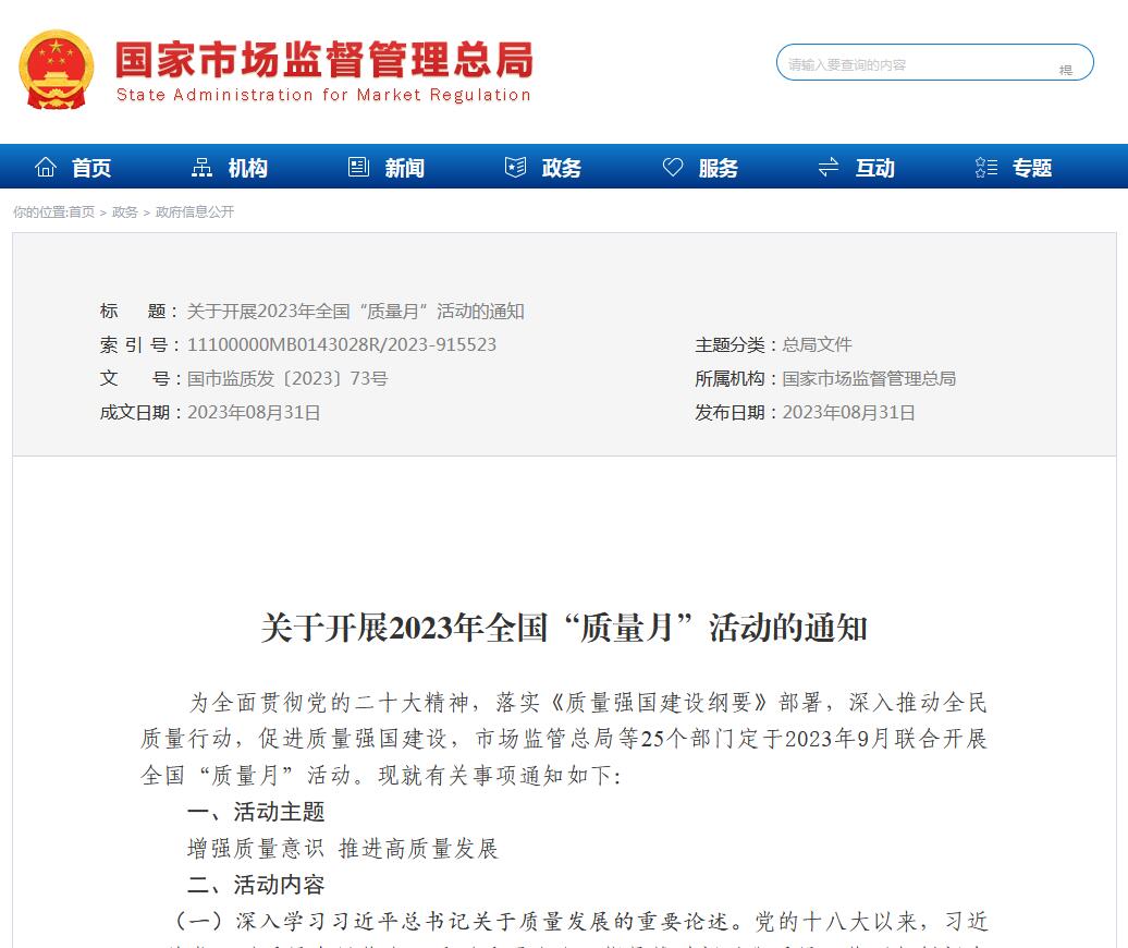 市場監(jiān)管總局等25個(gè)部門共同發(fā)布《關(guān)于開展2023年全國"質(zhì)量月"活動(dòng)的通知》發(fā)布