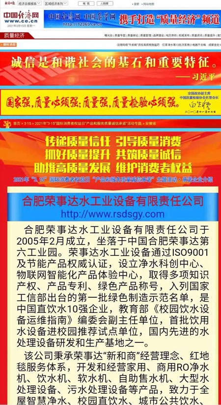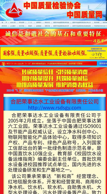 共筑質(zhì)量誠信,引導(dǎo)質(zhì)量消費。在由中國質(zhì)量檢驗協(xié)會主辦的2021年“3.15”國際消費者權(quán)益日“產(chǎn)品和服務(wù)質(zhì)量誠信承諾”主題活動中,榮事達(dá)憑借卓越的產(chǎn)品品質(zhì)及良好的社會形象,榮膺“全國產(chǎn)品和服務(wù)質(zhì)量誠信示范企業(yè)”“全國質(zhì)量信得過產(chǎn)品”“全國凈水行業(yè)質(zhì)量領(lǐng)先品牌”“全國質(zhì)量誠信先進(jìn)企業(yè)”多項榮譽,《中國質(zhì)量報》、《中國消費者報》及中國質(zhì)量網(wǎng)、中國經(jīng)濟(jì)網(wǎng)、中國消費網(wǎng)等多家媒體均予以集中展示和公告。