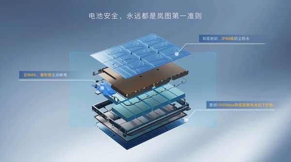 在電動(dòng)車(chē)最為關(guān)鍵的電池安全方面,嵐圖采用5層PACK方案,首創(chuàng)的“琥珀電池”采用三維隔熱墻技術(shù),從結(jié)構(gòu)到智能,全方位保障電池安全。在全球首個(gè)電動(dòng)車(chē)涉水后底部碰撞公開(kāi)測(cè)試中,嵐圖汽車(chē)獲得中汽中心“未冒煙、未起火、未爆炸、未進(jìn)水”的測(cè)試成績(jī),樹(shù)立了三元鋰電池系統(tǒng)安全新標(biāo)桿。此外,嵐圖研發(fā)了云BMS系統(tǒng)和PDD毫秒級(jí)緊急斷電功能,將電池危險(xiǎn)控制在萌芽階段。