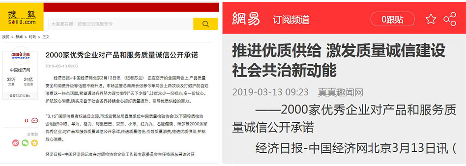 •中國(guó)消費(fèi)網(wǎng)《傳遞質(zhì)量信任,引導(dǎo)質(zhì)量消費(fèi)——中國(guó)質(zhì)量檢驗(yàn)協(xié)會(huì)在2019年3.15組織2000家優(yōu)秀企業(yè)對(duì)產(chǎn)品和服務(wù)質(zhì)量作出誠信承諾》