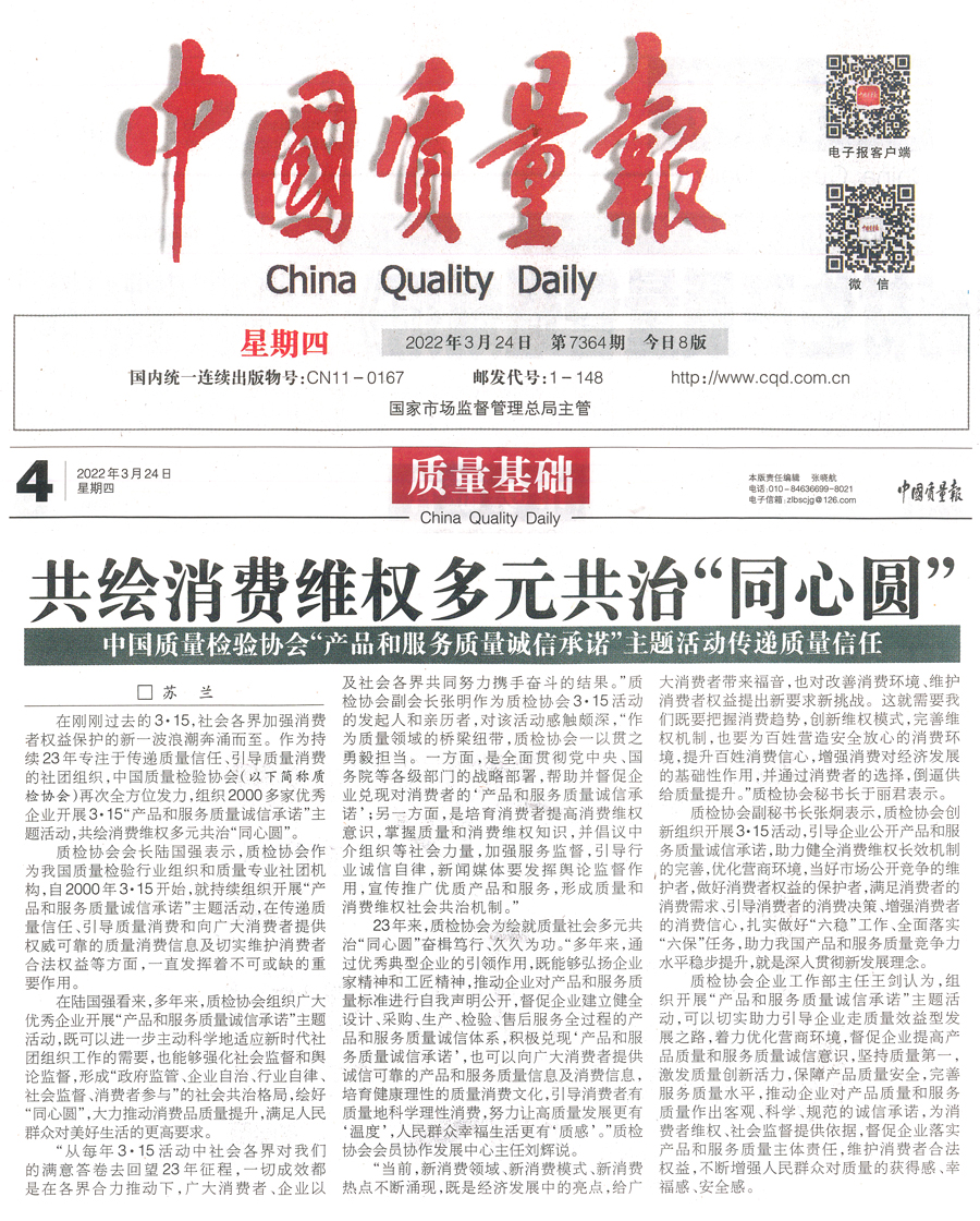 中國經(jīng)濟(jì)網(wǎng)北京3月15日訊(記者 蘇蘭) “一鼓春雷起九淵,風(fēng)云萬里會中天。”剛剛閉幕的全國兩會,匯聚起億萬人民團(tuán)結(jié)奮斗的磅礴偉力。伴隨著初春時節(jié)又一個“3·15”的到來,社會各界加強(qiáng)消費者權(quán)益保護(hù)的新一波浪潮奔涌而至。作為持續(xù) 23 年專注于傳遞質(zhì)量信任、引導(dǎo)質(zhì)量消費的社團(tuán)組織,中國質(zhì)量檢驗協(xié)會(以下簡稱質(zhì)檢協(xié)會)憑著“守初心,擔(dān)使命”的高度自覺,為推進(jìn)擴(kuò)大內(nèi)需、提振消費信心,積極維護(hù)消費者合法權(quán)益,助力廣大企業(yè)在新發(fā)展階段的高質(zhì)量發(fā)展,再次全方位發(fā)力,組織包括格力、美的、海爾、中糧、紅九九食品、中國石油、中國石化、全友家居、美克美家、名臣健康等2000多家優(yōu)秀企業(yè)開展“3·15”“產(chǎn)品和服務(wù)質(zhì)量誠信承諾”主題活動,共繪消費維權(quán)多元共治“同心圓”。
