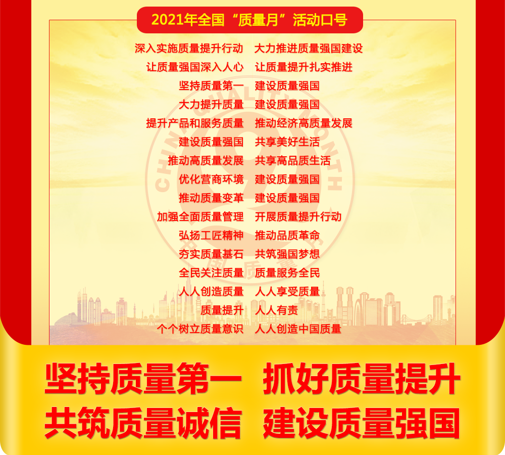 為深入貫徹習(xí)近平新時代中國特色社會主義思想,全面落實黨的十九大和十九屆二中、三中、四中、五中全會精神,立足新發(fā)展階段,貫徹新發(fā)展理念,構(gòu)建新發(fā)展格局,樹立質(zhì)量第一的強烈意識,不斷提升質(zhì)量總體水平,大力推進質(zhì)量強國建設(shè),市場監(jiān)管總局等20個部門定于2021年9月聯(lián)合開展以“深入實施質(zhì)量提升行動 大力推進質(zhì)量強國建設(shè)”為主題的2021年全國“質(zhì)量月”活動。